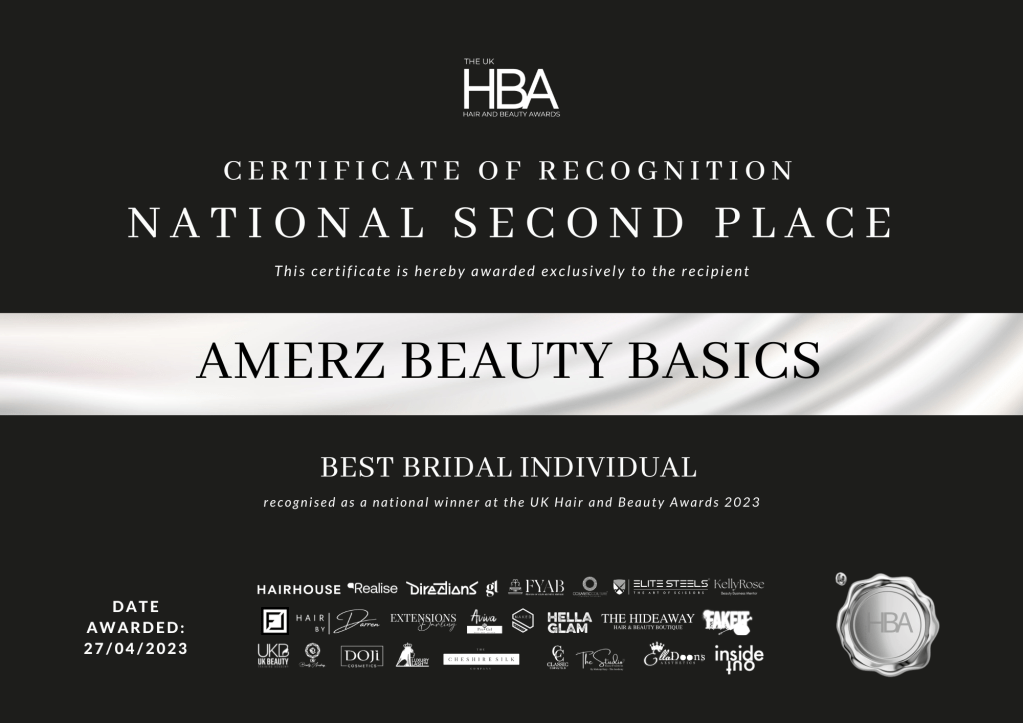 In 2023 at the UK Hair and Beauty Awards I won ‘Regional (Scotland) Makeup Artist of the Year‘, ‘Regional (Scotland) Best Bridal Makeup Individual‘ and National (UK) Second Place Best Bridal Makeup Individual‘. I was absolutely delighted to win these coveted titles and my thanks goes to all my lovely clients and creatives who book me for their events.